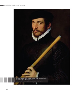 Patología ocular / Ocular pathology Anónimo, Retrato de un flautista tuerto, 1566, óleo sobre tabla, 62 x 50 cm, París, Museo del Louvre. Anonymous, Portrait of a One-eyed flautist, oil on board. 86 MONJE.indd 86 14/06/2016 7:55:37